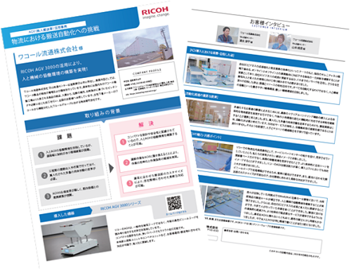 これらの課題解決の手段として、リコーの生産・物流拠点でも実際に利用されている、AGV(無人搬送車)を導入することで、物流拠点における在庫一元管理と商品搬送ルールを確立し、人と機械の協働環境を実現されました。