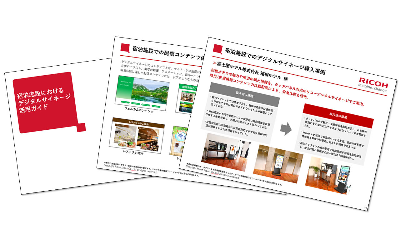 デジタルサイネージの基礎情報から、宿泊施設における活用シーンや配信コンテンツ例など、まるっとこの1冊に集約!
